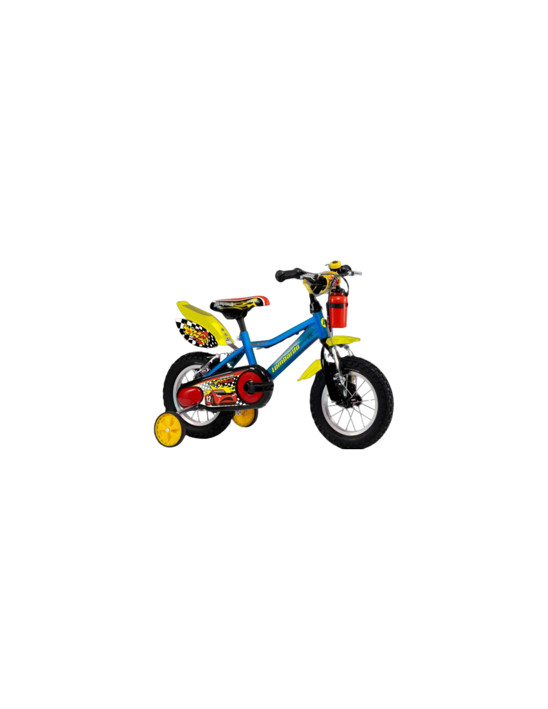 Telaio in acciaio misura unica 19cm, con rotelle e completa di borraccia, parafanghi, carter, campanello. Diametro ruote 12″, peso 9,1kg.